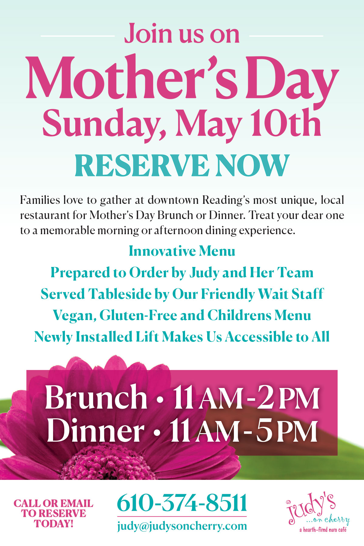 Families love to gather at downtown Reading’s most unique, local restaurant for Mother’s Day Brunch or Dinner. Treat your dear one to a memorable morning or afternoon dining experience. Each dish is prepared to order by Judy and her team and delivered tableside by our cheerful and attentive wait staff! Service begins at 11AM and our innovative menu is a la carte. Vegan, gluten free and children’s options are available! And, our recently installed lift makes us accessible to the entire family!